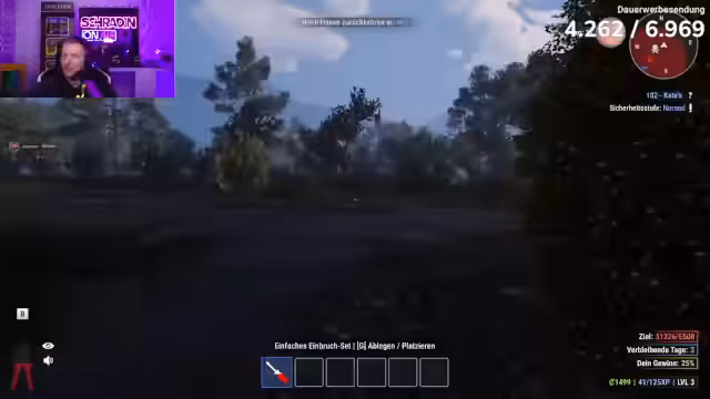 04:20:03Schradin initiiert eine Serie von Sprengungen im Spiel, darunter das Rathaus und den Barbershop, und rechtfertigt dies mit „zwei Wochen Frust“ durch Sabotagen anderer Spieler. Die Aktion führt zu einem Server-Bann für das nächste Jahr. Während die Moderatoren die Regelverstöße betonen, argumentiert Schradin im Stream emotional, dass dies eine „Crash-Out-Aktion“ nach konstanter Provokation sei. Backup-Systeme stellen die Gebäude später wieder her.