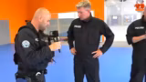 01:52:54Nach dem Anziehen der Uniform wird die Handhabung von Pfefferspray demonstriert. Es wird erklärt, dass dies das am seltensten eingesetzte Mittel ist und erst nach einer Abwägung der Verhältnismäßigkeit zur Anwendung kommt. Der Wirkstoff Kapsaicin verursacht starke Reizungen an Augen, Nase und Mund und kann auch auf der Haut brennen. Die Wirkdauer ist nach dem Auswaschen beendet, im Ernstfall wird jedoch sofort ein Rettungsdienst gerufen. Die demonstration zeigt die starke Reizwirkung und den unangenehmen Geruch des Sprays auf.