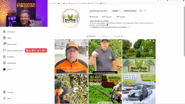 01:52:47Der Streamer stellt Florian vor, einen Gartenpfleger aus Gifhorn, der aufgrund einer Auftragsflaute Unterstützung sucht. Florian bietet verschiedene Dienstleistungen wie Baumschnitt, Heckenpflege und Rasenmähen an. Der Streamer ruft die Zuschauer auf, Florians TikTok-Kanal zu folgen und ihn bei möglichen Gartenarbeiten zu kontaktieren. Innerhalb kurzer Zeit kann Florians Followerzahl deutlich gesteigert werden.
