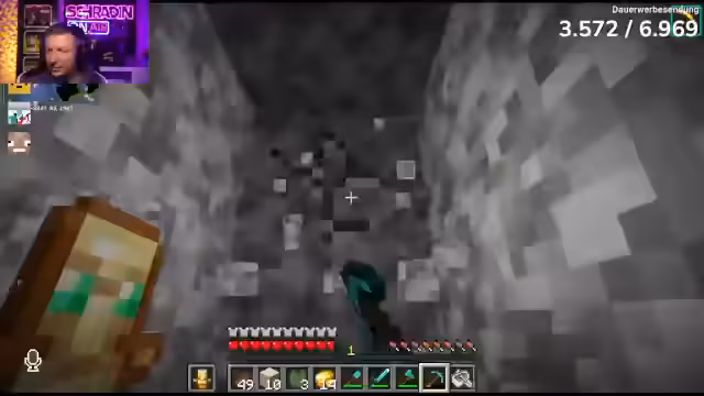 01:02:02Die Streamer tauchen in den Untergrund und beginnen mit der Suche nach Diamanten. Nachdem sie anfangs nur eine kleine, wenig ertragreiche Höhle entdecken, stoßen sie bald auf eine massive Riesenhöhle. Dies wird als der ideale Ort für die Diamantsuche identifiziert. In dieser großen Halle beginnen sie damit, Bereiche abzuarbeiten und Diamanten zu farmen, wobei einer von ihnen dank einer besseren Spitzhacke mit Glück-Effekt die Diamanten abbaut und dem anderen freigibt.