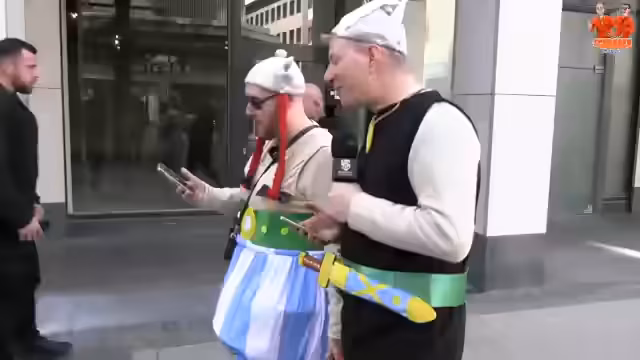 00:24:09Das Duo interagiert mit Zuschauern, die ihre Kostüme loben und Fotos machen möchten. Es wird über die Herkunft der Kostüme diskutiert und festgestellt, dass sie aus Schradins Feder stammen. Obelix wird für seine vermeintliche Gewichtsabnahme gelobt, während Asterix' Outfit gemischte Reaktionen hervorruft. Die beiden schlendern durch die Menge, lassen sich treiben und sind offen für neue Erfahrungen. Es wird über die Schwierigkeit des Toilettengangs in den Kostümen gescherzt, und Asterix droht Obelix mit Konsequenzen, falls er ihm erneut in die Eier schlägt. Trotz kleinerer Scharmützel und Beschwerden über die Enge und den fehlenden Bierstand freuen sie sich auf den Tag und die gemeinsame Zeit.