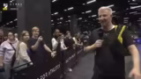 01:57:31Der Streamer interagiert stark mit der Community, liest Kommentare und reagiert auf deren Reaktionen, insbesondere auf den eigenen mäßigen sportlichen Leistungen wie nur zwei Liegestütze. Gleichzeitig moderiert er das Event, stellt Athleten vor und sorgt für eine unterhaltsame Atmosphäre. Die Mischung aus Sport und Entertainment bleibt im Fokus, während die Halle als Schauplatz der FIBO präsent wird.