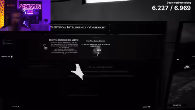 06:50:55Eine neue Runde beginnt mit dem Ziel, Geld zu verdienen und das Spiel besser zu verstehen. Es wird über die Schwierigkeit diskutiert, mit den vorhandenen Hinweisen weiterzukommen und ob sich die Geistercharaktere ändern. Der Geist wird als Judith Knox identifiziert. Es wird versucht, mit dem Geist zu kommunizieren, aber die Versuche sind erfolglos. Es wird überlegt, ob man leise sein muss, um den Geist anzulocken. Es kommt zu Problemen und der Streamer äußert seine Frustration darüber, dass er sich dumm vorkommt. Es wird versucht, den Geist mit verschiedenen Fragen und Methoden zu provozieren, aber ohne Erfolg. Schließlich wird ein Hinweis gefunden, der auf die Staffelei deutet. Es wird überlegt, ob man die Staffelei ausschließen kann, aber es besteht Unsicherheit. Es wird versucht, weitere Hinweise zu finden, aber die Zeit drängt und die Angst vor einem erneuten Angriff des Geistes wächst.