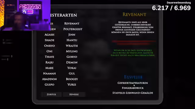 05:26:31In einer hitzigen Phase der Geisterjagd äußert sich die Frustration über das eigene Unvermögen und die vermeintliche Inkompetenz des Mitspielers. Trotz Unterstützung durch Spenden und Abonnements, fühlt man sich vom Chat überfordert. Ein Geist steht direkt vor der Tür, was zu panischen Reaktionen führt. Der Versuch, sich im Schrank zu verstecken, wird als Fehler erkannt, da der Geist den Aufenthaltsort kennt. Es folgt eine Diskussion über die richtige Vorgehensweise, um den Geist herauszulocken und die benötigte Box zu finden. Der Name des Geistes, Sala De Leon, wird mehrfach wiederholt, während man versucht, ihn mit dem Sprachrohr zu kontaktieren. Die Situation eskaliert in gegenseitigen Beschimpfungen und dem Eingeständnis, sich dumm vorzukommen. Trotz der Schwierigkeiten wird versucht, taktisch vorzugehen und sich aufzuteilen, um das Spiel doch noch erfolgreich zu meistern. Der Fokus liegt darauf, nicht zu sterben und die eigenen Fähigkeiten zu beweisen. Nach dieser angespannten Sequenz wird die bisherige Leistung als sehr gut bewertet, obwohl man sich uneins ist, um welchen Geist es sich handelt. Eine Analyse der Beweislage und des Verhaltens des Geistes soll Klarheit bringen, wobei verschiedene Geistertypen wie Dämon, Mare, Hantu und Revenant in Betracht gezogen werden. Der Chat liefert unterschiedliche Hinweise, was die Verwirrung noch verstärkt. Letztendlich wird versucht, durch das Sammeln von EMF-Daten und anderen Beweisen den richtigen Geist zu identifizieren.