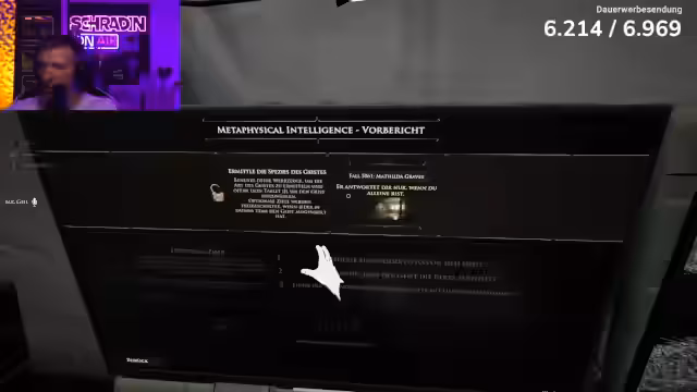 09:19:36Die Streamer erkunden das Krankenhaus und suchen nach dem Raum, in dem sich der Geist aufhält. Sie nutzen die Geisterbox, um mit dem Geist zu kommunizieren. Ein Fingerabdruck wird gefunden. Die Streamer werden von dem Geist gejagt. Es wird über die Schwierigkeit des Spiels und die gruselige Atmosphäre diskutiert. Die Streamer sprechen über andere Horrorspiele wie Madison und Visage. Sie tauschen sich über Jumpscares und gruselige Momente aus. Durch die Kommunikation mit dem Geist wird der Operationssaal als Aufenthaltsort identifiziert. Dort werden die Geräte platziert. Es kommt zu einer Jagd, bei der ein Spieler verfolgt wird. Der Raum wird gefunden und als Operationssaal identifiziert. Die Streamer platzieren ihre Ausrüstung und bereiten sich auf die nächste Phase vor.