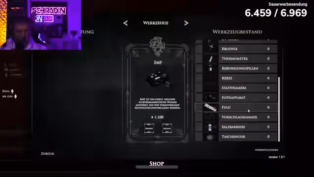 08:59:39Nach dem erfolgreichen Exorzismus wird das Ziel formuliert, in allen drei Maps (Cyclone Street, Abondant House, Deadwood House) den Exorzismus durchzuführen. Deadwood House steht als nächste Herausforderung an. Es folgt eine Diskussion über die Ausrüstung für die nächste Runde. Der Fokus liegt auf dem Kauf von Beruhigungspillen und Kruzifixen, um sich bestmöglich vor den Gefahren zu schützen. Die Streamer einigen sich darauf, für jeden eine Beruhigungspille zu kaufen. Nach dem Kauf der Ausrüstung wird die nächste Runde in Deadwood House gestartet. Die Streamer wählen ihre Ausrüstung aus, darunter die lila Lampe, die Geisterbox und den Kompass. Sie sprechen über die Notwendigkeit, Fingerabdrücke zu finden, um den Geist zu identifizieren. Die Schwierigkeit, Fingerabdrücke zu finden, wird hervorgehoben, da diese überall sein können.