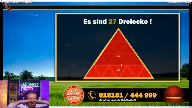 05:12:04Ein Anrufer namens Alina tippt auf 27 Dreiecke und gewinnt 100 Euro. Es wird erklärt, wo sich die 27 Dreiecke in der Grafik befinden. Alina bleibt kurz in der Leitung, um die Auflösung zu verfolgen. Es wird angekündigt, dass es sich um ein klassisches Gewinnspielformat handelt, das vielleicht einmal im Jahr stattfinden wird. Es wird eine neue Knobelaufgabe angekündigt. Es wird klargestellt, dass 27 die richtige Lösung für das Dreiecke-Zählspiel ist. Die Auflösung des Dreiecke-Zählspiels wird noch einmal detailliert erklärt, um Missverständnisse auszuräumen. Es wird betont, dass keine Dreiecke hinzugefügt wurden, wo keine sind. Die verschiedenen Dreiecksgrößen werden einzeln durchgegangen. Es wird erklärt, dass die Zahl 26 das große Dreieck umrandet und die Zahl 27 das etwas kleinere Dreieck darin darstellt. Es wird betont, dass im Stream Menschen mit unterschiedlichen Fähigkeiten willkommen sind und alle abgeholt werden sollen.