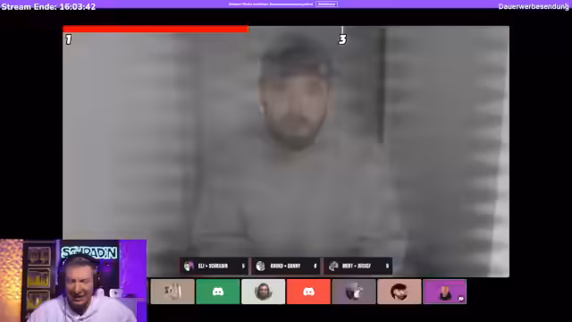 07:42:32Das Quiz-Duell startet mit dem ersten Spiel 'Bilder erkennen'. Die Teams bestehen aus Schradin und Maximal, Mert und Josef sowie Kroko und Danny. Ein Buzzer-System wird in einem privaten Chat für die Teams eingerichtet, um schnell reagieren zu können. Die Bilder werden schrittweise schärfer, um die Schwierigkeit zu erhöhen. Wer zuerst den Buzzer drückt und die richtige Antwort nennt, erhält Punkte. Allerdings gibt es auch technische Unstimmigkeiten und Minuspunkte, die fälschlicherweise vergeben werden und für Unstimmigkeiten sorgen.