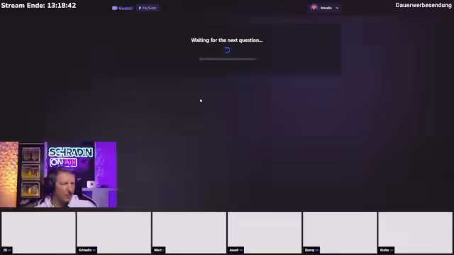 10:12:16Nach Abschluss des Dings-Spiels wechselt der Stream zu einem Allgemeinwissen-Quiz mit Multiple-Choice-Fragen. Die Teilnehmer antworten nun einzeln auf Fragen aus verschiedenen Wissensgebieten wie Geografie und Wissenschaft. Das Quiz verläuft interaktiv, da die Teilnehmer ihre Antworten gleichzeitig hochhalten und Punkte für richtige Antworten sammeln.