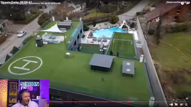 17:00:21Der Streamer führt eine extravagante Tour durch seine Wohn- und Freizeiteinrichtungen, darunter einen mit Blattgold verzierten Whirlpool, einen eigenen Helikopterlandeplatz und eine private Tischtennisplatte. Diese Darstellung des extremen Wohlstands steht im starken Kontrast zu seinen Aussagen über Werte. Er betont, aus einfachen Verhältnissen zu stammen und die Wichtigkeit von Dankbarkeit und der Fürsorge für seine Kinder zu sehen, wobei er den Luxus als etwas betrachtet, das er sich durch harte Arbeit verdient hat und das nicht vergänglich ist.