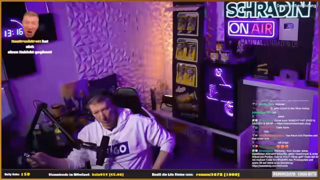 14:34:09Gegen 3:40 Uhr zeigt sich der Streamer von seiner Community sichtlich bewegt und dankbar für deren anhaltende Präsenz und Unterstützung. Er erwähnt die hohe Zuschauerzahl und hebt den großen Respekt hervor, den er für die Zuschauer empfindet, die noch zu dieser ungewöhnlichen Uhrzeit wach sind und im Stream verweilen. Eine Reihe von massiven Sub-Geschenken, darunter mehrere 'Bomben' mit bis zu 100 Subs, führt zu einer spontanen Explosion neuer Abonnenten und erntet große Dankbarkeit und Anerkennung seitens des Streamers.