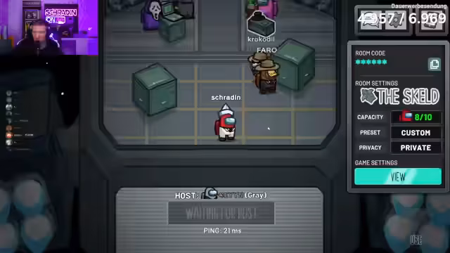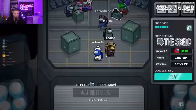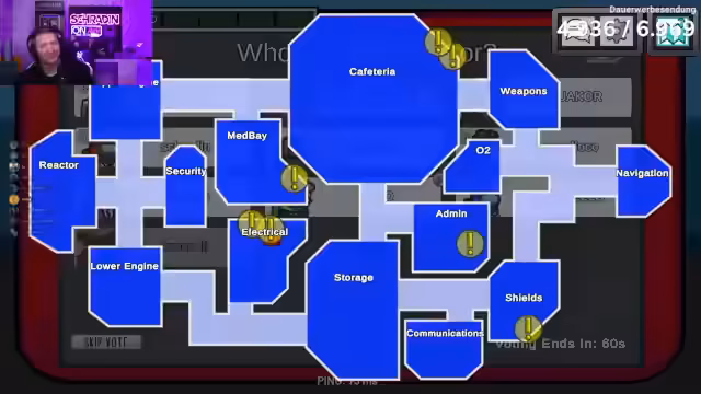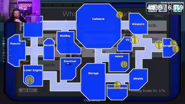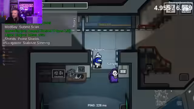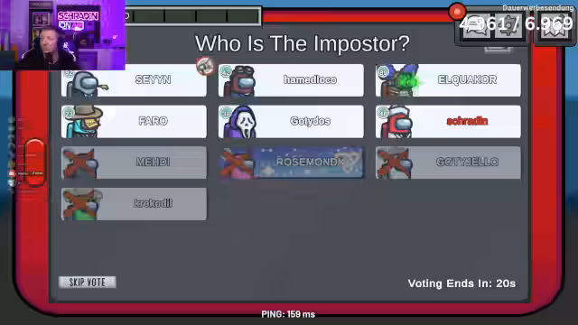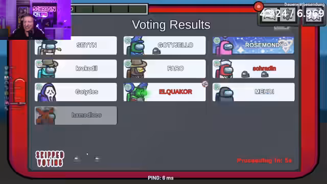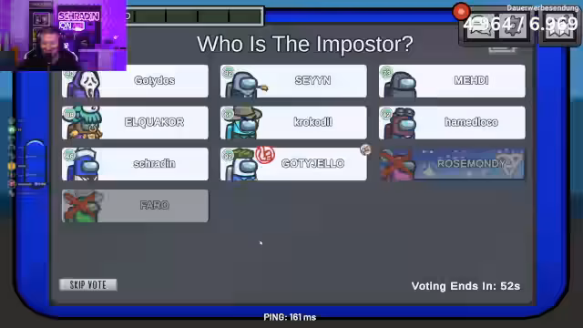 02:50:19Hamid wird in der Cafeteria getötet. Demi wird zu 100% als unschuldig erklärt. Eldos, Gottidos und Faro werden verdächtigt. Eli wird fälschlicherweise als Gottidos bezeichnet. Die Spieler diskutieren die Laufwege und Alibis der Verdächtigen. Schradin wird erneut verdächtigt, obwohl er beteuert, nichts getan zu haben. Die Gruppe beschließt, Schradin zu wählen, da er als Imposter identifiziert wurde. Schradin äußert seinen Frust über die ständigen Anschuldigungen und die mangelnde Fairness im Spiel. Er quittet die Runde, da er sich ungerecht behandelt fühlt.