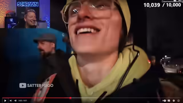 00:10:57Die Reihe der Reaktionen auf "Satter Hugo" wird fortgesetzt. Währenddessen schießt die Anzahl der Abonnenten schnell in die Höhe. Unterstützer wie "Subtrox" spenden massive Subbomben. Die erreichte Zahl von 10.000 Abonnenten wird gefeiert und als geisteskrank bezeichnet. Der Streamer kündigt an, den YouTube-Kanal weiter aufzubauen und näher auf die Anzahl der Abonnenten einzugehen.