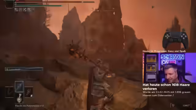 02:29:28Reaper kritisiert Schradins kurze Aufmerksamkeitsspanne und seine Tendenz, während Filmsequenzen zum Handy zu greifen. Sie scherzen über Dating-Apps und Fußball. Schradin betont, dass er Spaß an Elden Ring hat und dass er beim letzten Mal in einem tiefen Loch war. Er erklärt, dass er manchmal in eine "es-bringt-nix-Laune" verfällt, was ihm von einigen Zuschauern übel genommen wurde. Er betont, dass es normal ist, auch mal schlecht drauf zu sein und seinen Glauben und sein Mindset zu verlieren. Sie reiten weiter und folgen dem Pfad. Schradin springt über eine Schlucht und stürzt ab, was zu Ärger führt. Er macht einen Witz über Fickschafe und schaltet die Lampe ein, um besser zu sehen. Er reitet auf das Licht zu und erreicht die nächste Gnade.
