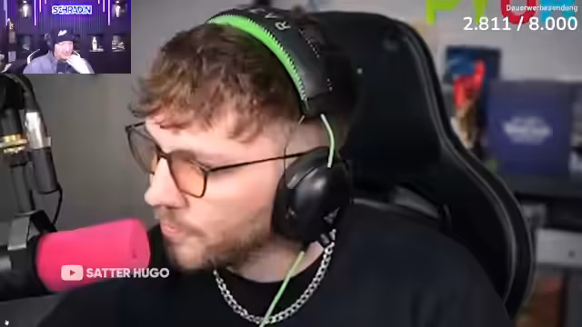 02:52:48Der Stream wechselt nun zum Format "Reaction", speziell einem "Satter Hugo"-Video. Schradin analysiert die gezeigten Personen und Situationen mit hohem Unterhaltungswert. Er kommentiert u.a. einen vermeintlichen Zusammenhang zwischen den Charakteren "Willi" und "Samanick" sowie die Aussprache des Begriffs "WiFi", was zu humorvollen Auseinandersetzungen mit dem Chat führt.