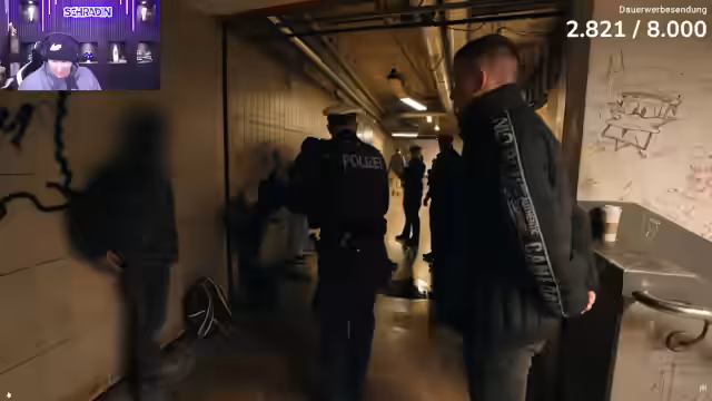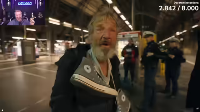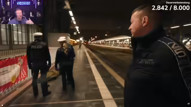 03:15:50Als nächstes starten die Streamer eine Dokumentation namens "Brennpunkt Hauptbahnhof Frankfurt" mit dem Reporter Aaron Troschke. Sie beobachten zusammen die Nachtschicht der Bundespolizei und werden selbst Zeuge eines herrenlosen Gepäckstücks mit vermutlich Betäubungsmitteln. Schradin zeigt sich beeindruckt von der Arbeit der Polizei und dem bunten Treiben auf dem Frankfurter Bahnhof.