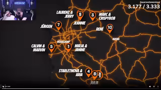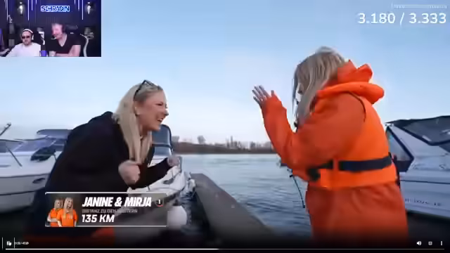 02:15:08Die Streamer befinden sich auf der Fahrt und versuchen, den Zielen der Show hinterherzujagen. Ein Ziel, das angeblich in Koblenz ist, erweist sich als Täuschungsmanöver, um die 'Huntern' zu verwirren. Die Streamer analysieren die Aktion und kommentieren, wie die teilnehmenden Paare versuchen, sich gegenseitig mit strategischen Moves und Psychospieleinsätzen zu täuschen, was den Reiz des Formats ausmacht.