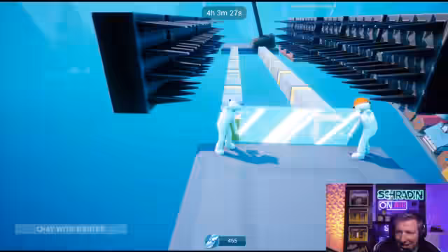 05:47:21Zu Beginn des Streams arbeiten die Streamer an einer koordinierten Bewegung bei der Schiebeplattenaufgabe. Die Kommunikation ist anfangs holprig, da sie darauf achten müssen, sich gegenseitig Platz zu lassen und synchron zu agieren. Zarbex versucht, Schradin den richtigen Winkel für den Sprung zu zeigen, während die beiden mühsam die erste Etappe bewältigen und aufeinander abstimmen müssen.