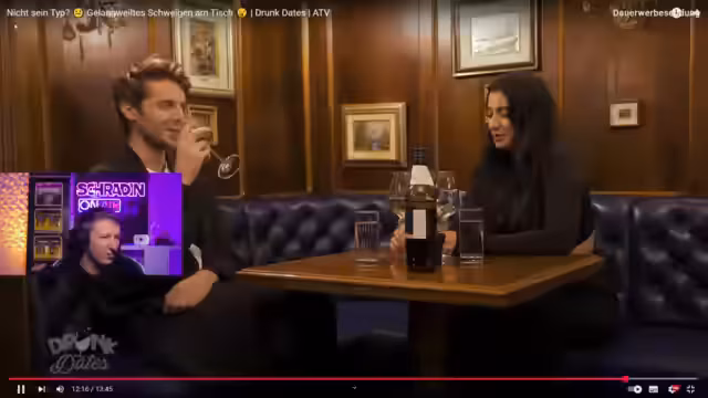 01:12:26Melissa ist auf der Suche nach einem reichen Partner und hat in den letzten neun Monaten fünf Dates hinter sich, die allesamt scheiterten. Patrick dagegen sucht eine bodenständige Frau. Sie kommen ins Gespräch über Sternzeichen, wobei der Streamer seine Skepsis gegenüber Astrologie zum Ausdruck bringt. Nach dem Trinken beginnt Melissa sofort zu flirten, während Patrick eher zurückhaltend wirkt. Sie sprechen über One-Night-Stands und past Beziehungen, wobei Melissa von einem Ex-Freund berichtet, den sie als berühmt bezeichnet.