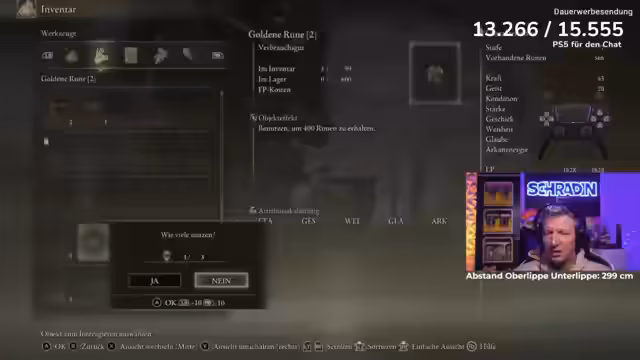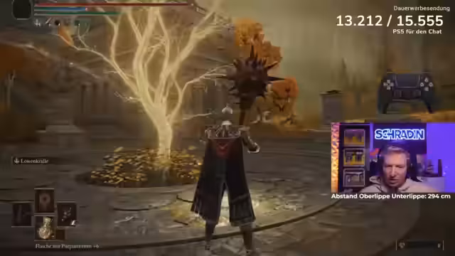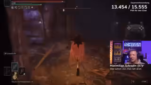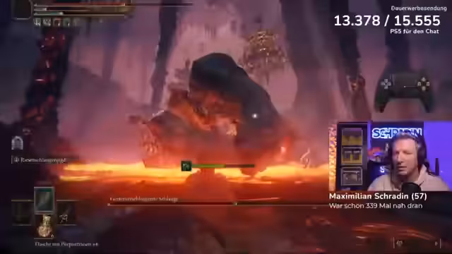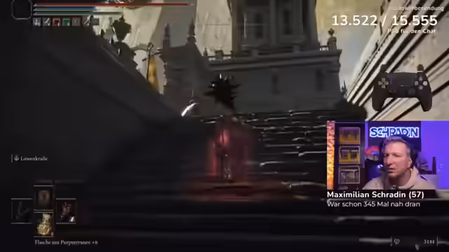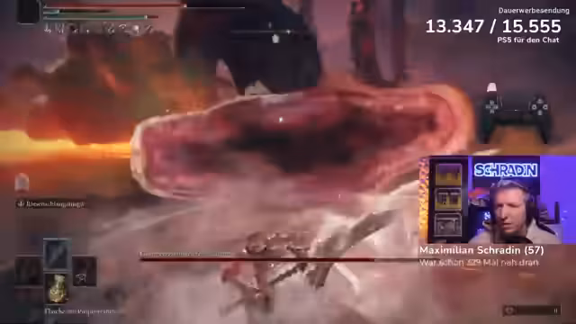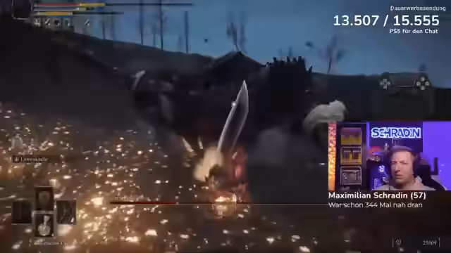 05:34:21Der Stream konzentriert sich auf einen Bosskampf in Elden Ring, bei dem der Spieler, Schradin, mehrmals scheitert. Ein Coacher gibt kontinuierlich Anweisungen und kritisiert Schradins Spielweise scharf. Er wirft ihm vor, nicht in Reichweite zu sein, zu früh auszuweichen, ungenügend zu heilen und Mana zu verschwenden. Der Coacher beschreibt den Kampf als "easy Boss" und drückte seine Frustration über die wiederholten Fehler aus, während der Spieler trotz guter Ansätze in der ersten Phase in der zweiten Phase scheitert.