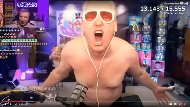 00:54:40Nachdem das ernsthafte Thema der Spenden und des Hasses geklärt ist, geht der Streamer zurück zum geplanten Entertainment-Programm. Er beginnt mit der Vorstellung der Reactions, insbesondere der Videos 'Satter Hugo' und 'Hey Aaron'. Vor dem Start der Videos gibt es kurze technische Verzögerungen, da der Ton für die Spenden- und Sub-Benachrichtigungen nicht wie gewünscht funktioniert. Der Streamer nimmt sich die Zeit, ein kurzes Gespräch mit seinem technischen Team zu führen, um das Problem zu beheben und stellt sicher, dass die Subs im Vordergrund vor der eigentlichen Content-Phase des Streams korrekt angezeigt werden.