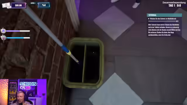 03:43:18Der Stream beginnt mit der Einrichtung eines Nachtclubs, der ausschließlich Bargeld akzeptiert. Schradin und Zarbex stellen fest, dass die Toiletten extrem verschmutzt sind, mit Urin, Blut und anderen unappetitlichen Rückständen. Sie beginnen mit der Reinigung, stoßen aber auf anfängliche Schwierigkeiten bei der Bedienung der Spielfunktionen, wie das Aufnehmen und Abstellen des Besens. Zarbex übernimmt die Rolle des Putzpersonal, während Schradin die grundlegende Einrichtung vorantreibt.