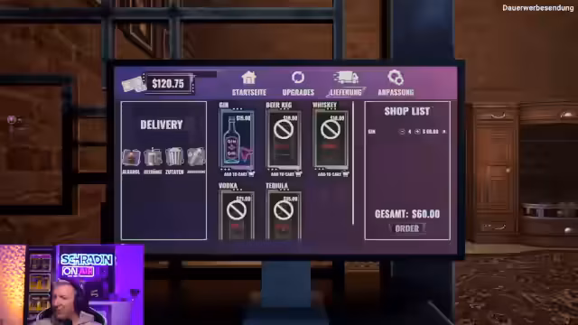 03:46:27Nach der anfänglichen Reinigung konzentrieren sich die Streamer auf den laufenden Betrieb. Sie mischen die ersten Getränke, hauptsächlich Gin-basierte Cocktails wie den 'Fusion' und 'Double Fusion', und stellen fest, dass nur zwei der vier Stehpisser gleichzeitig benutzt werden dürfen, da einer immer frei bleiben muss. Die ersten Kunden erscheinen, und es kommt zu ersten Interaktionen, wobei Zarbex die Eintrittskasse übernimmt und Schradin die Getränke bestreitet. Dabei gibt es anfangs Probleme mit der korrekten Wechselfeld-Ausgabe.