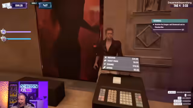 04:07:38Am Ende des ersten Tages stellt der Streamer fest, dass der Club einen finanziellen Verlust eingefahren hat. Sie entscheiden, den Tag zu beenden und den nächsten Tag vorzubereiten. Schradin übernimmt nun vollständig die Rolle des Barkeepers und mischt Drinks im Voraus, während Zarbex die Kassenverantwortung übernimmt. Sie analysieren ihre Fehler, wie das falsche Management von Wechselgeld und die zu niedrigen Ticketpreise, und planen, diese für den nächsten Tag zu korrigieren, um Prestigestufe 2 zu erreichen.