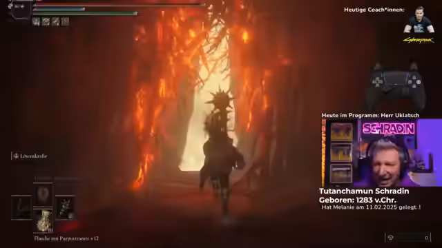 03:17:23Nachdem der Streamer den Talisman erfolgreich aufgesammelt hat, konzentrieren sich die Vorbereitungen auf den finalen Bosskampf. Der Coach weist darauf hin, dass der bisherige Kampf gegen Radagon nur die Vorbereitung für den eigentlichen Endgegner, das Eldenbeast, war. Bevor der finale Anlauf gestartet wird, stellt der Streamer fest, dass er nicht genug goldene Saaten für die letzten Upgrades seiner Heiltränke besitzt. Gemeinsam mit der Community und den Coaches wird eine gezielte Suche nach der verbleibenden Saat gestartet, die sich in einem schwer zugänglichen Dungeon im Lavafeld befindet.