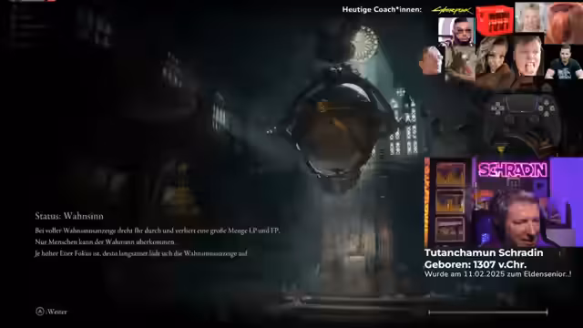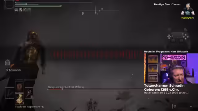 04:04:36Der Streamer ist im finalen Kampf gegen den Endboss des Spiels, den Eldenfürsten. Es kommt zu wiederholten Problemen mit der Zielausrichtung und der Boss-Interaktion. Die Coaches rufen ihm Anweisungen zu, er muss sich abvisieren, heilen und im Kreis um den Boss laufen. Trotz intensiver Bemühungen scheitert er mehrfach und wird von den Angriffen des Bosses erfasst. Der Verlauf des Kampfes ist von hohem Druck und ständigen Anfeuerungen durch die Coaches geprägt, die ihm zum richtigen Zeitpunkt zum Sieg verhelfen wollen.