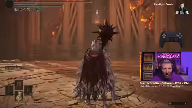 02:43:38Nach erfolgreichem Abschluss der ersten Phase beginnt die zweite, komplexere Phase des Kampfes gegen Radagon. Hier verändert sich der Kampfverhalten des Bosses drastisch, er greift mit heiligen Blitz- und Feuerringen an, die für den Streamer eine große Herausforderung darstellen. Der Coach gibt eine spezifische Taktik für die zweite Phase vor: Anvisieren, zwei Angriffe mit L2 ausführen und dann sofort rechts an Radagon vorbeigehen, um den Feuerbereich zu umgehen und weitere Angriffe zu landen. Gleichzeitig weist der Coach darauf hin, dass das Pferd als Unterstützungsmittel eine neuere Änderung (Quality of Life) im Spiel darstellt.