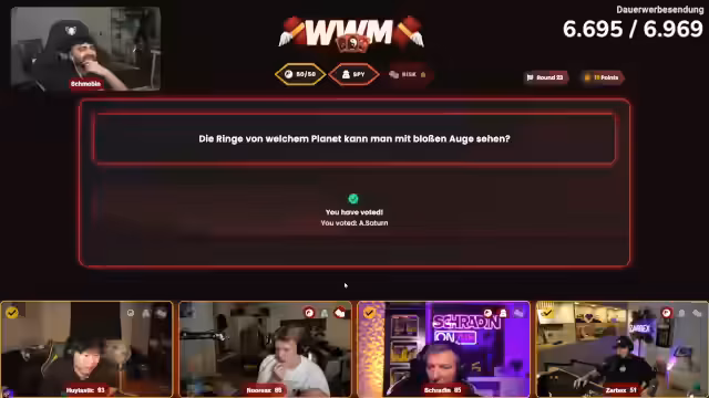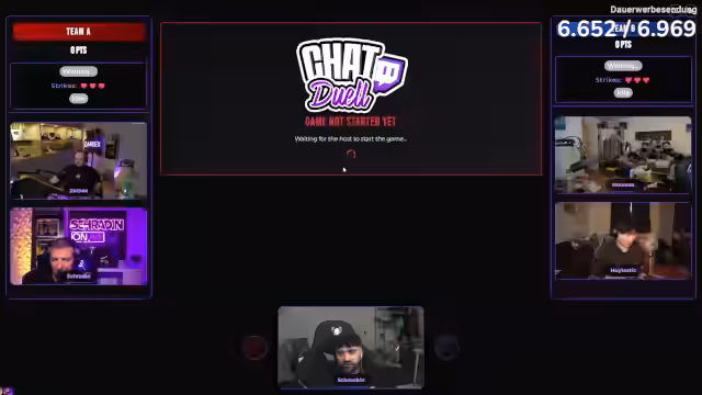 00:08:50Der Stream startet mit Begrüßungen und einer Ankündigung des heutigen Programms. Es wird ein Quiz-Spiel namens „Duell im Chat“ geplant, das gemeinsam mit Zabex, Noreax und Hui gespielt wird. Nach technischen Startschwierigkeiten bei der Einrichtung des Spielsystems wird die Funktionsweise erklärt. Zabex darf die erste Kategorie wählen und die erste Frage beantworten. Ein ständiger Wettbewerb zwischen den Teilnehmern, vor allem zwischen Schradin und Zabex, ist von Beginn an spürbar.