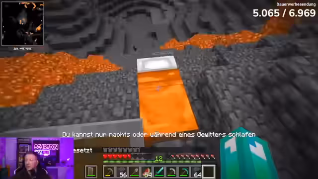 00:10:03Nachdem die Grundversorgung mit Nahrung gesichert ist, konzentriert sich der Stream auf die Jagd nach Eisen. Die Strategie verlagert sich vom Abbau an der Oberfläche in die Tiefen des Untergrunds. Mit Hilfe einer Karte wird ein Höhlensystem lokalisiert. Im Inneren der Höhle werden Ressourcen wie Eisen gesammelt, während gleichzeitig ständige Gefahren wie die Spawn von Monstern und die Anwesenheit von Lava beachtet werden müssen, um den Verlust der wertvollen Ressourcen zu vermeiden.