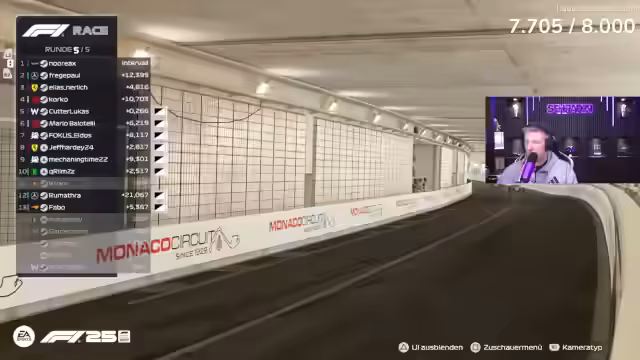02:42:15Nach einem Umstieg in den allgemeinen Chat beginnt das Rennen in Monaco. Nach anfänglichem Chaos, in dem der Streamer erneut in die Box gerät, stabilisiert sich seine Position. Er kämpft sich nach vorne, hat aber mit Schäden an seinem Auto zu kämpfen, insbesondere nach einer Kollision mit Zane. Trotz eines eigenen Fahrfehls, der ihn auf den 14. Platz zurückwirft, ist er stolz auf seine Leistung. Er ermutigt seine "Teampartner", Punkte zu sammeln und betont die Wichtigkeit eines schadenfreien Rennens.