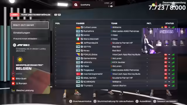 02:57:01Die Vorbereitung für das Rennen in Belgien, eine 11-Runden-Schlacht mit doppelten Punkten, läuft. Es wird eine Strategie mit einem Boxenstopp in der fünften Runde besprochen. Der Streamer zeigt sich hochmotiviert und sieht Belgien als seine Lieblingsstrecke. Während des Qualifying in Belgien kämpft er um die erste Startposition, während andere Teilnehmer wie Romatra und Sascha ebenfalls sehr starke Leistungen zeigen.