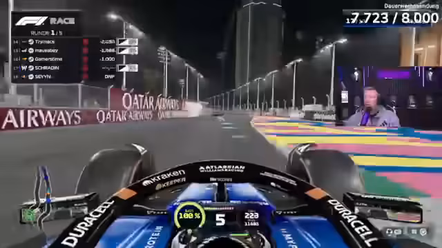 02:22:54Das Rennen startet mit einer Reihe von Kollisionen. Der Streamer wird von einem anderen Fahrer, später als Trimax identifiziert, in eine unfreiwillige Boxenfahrt gedrängt und fällt dadurch massiv in der Wertung zurück. Er ist extrem verärgert über das "Griefen" und den unfairen Vorteil, den andere Fahrer durch aggressive Manöver und möglicherweise zu viele Fahrhilfen erlangen. Die Situation eskaliert, als mehrere Fahrer, darunter Eli, Max, Trimax und Maus, in Unfälle verwickelt sind.