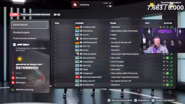 01:20:59Das Qualifying beginnt nach einigen technischen Verzögerungen, bei der nicht alle Fahrer rechtzeitig in der Lobby anwesend sind. Der Start gestaltet sich chaotisch, da viele Teilnehmer Probleme haben, ihr Auto zum Losfahren zu bringen. Es stellt sich heraus, dass man zum Starten die Taste 'X' gedrückt halten muss, bevor die Lichter ausgehen. Diese unklare Anführung führt zu vielen Fehlstarts und Frustration bei den Fahrern, besonders bei denen, die zum ersten Mal mitspielen.