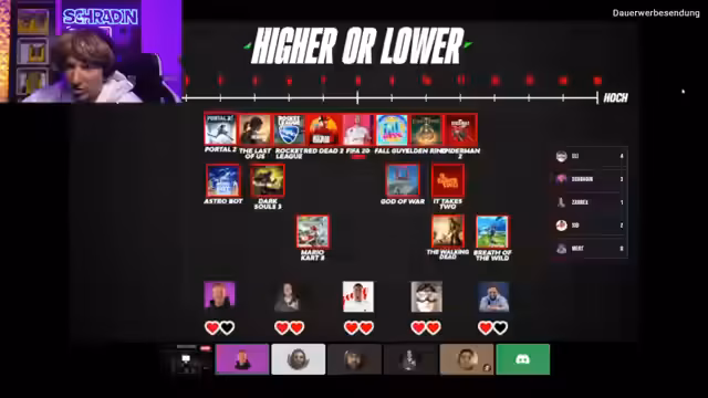03:54:53Es wird ein Spiel namens 'Higher Lower' gespielt, bei dem es darum geht, zu erraten, welcher von zwei Begriffen häufiger gegoogelt wurde. Die Regeln werden erklärt: Drei Versuche, der beste Versuch zählt, und bei Verlust Seite neu laden. Schradin und die anderen Teilnehmer spielen, aber Schradin findet das Spiel zu schwer. Es kommt zu Diskussionen über die Highscores, wobei Schradin beschuldigt wird, zu schummeln. Er verteidigt sich und betont, dass es ihm egal ist, da er in diesem Spiel ohnehin Letzter ist. Zabex äußert Angst vor dem bevorstehenden Karnevals-Livestream am Montag. Eli berichtet, dass er für Zabex' Sicherheit zwei Security-Leute von der Icon League engagiert hat, um ihn zu beruhigen. Es wird über die Punktverteilung im Spiel diskutiert, wobei der Erste vier Punkte, der Zweite drei Punkte, der Dritte zwei Punkte, der Vierte einen Punkt und der Letzte null Punkte erhält.