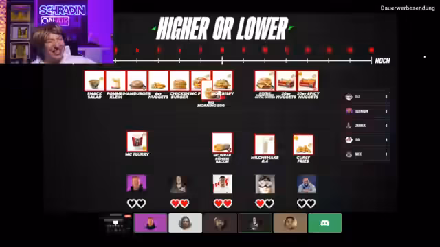 06:20:54Die letzte Kategorie von Higher or Lower wird gestartet: McDonalds-Produkte nach Kalorien. Die Teilnehmer müssen die Produkte nach ihrem Kaloriengehalt ordnen. Sidney beginnt, und die Teilnehmer geben ihre Einschätzungen ab. Es kommt zu hitzigen Diskussionen und Verwirrung, insbesondere bei den Spicy Nuggets. Die Teilnehmer versuchen, die Kalorien richtig einzuschätzen und gleichzeitig nicht auszuscheiden. Die Stimmung ist angespannt und humorvoll, während die Teilnehmer versuchen, die Produkte richtig zu ordnen und gleichzeitig nicht auszuscheiden. Es wird über die Kalorien von Salat und Pommes diskutiert, und die Teilnehmer geben ihr Bestes, um die richtige Reihenfolge zu finden. Die letzte Kategorie verspricht weitere spannende Momente und unerwartete Wendungen, während die Teilnehmer um den Sieg kämpfen. Es kommt zu Fehlentscheidungen und Jubel, wenn die Einschätzungen korrekt sind. Schradi versucht mitzugeben aber scheidet auch in dieser Runde aus.