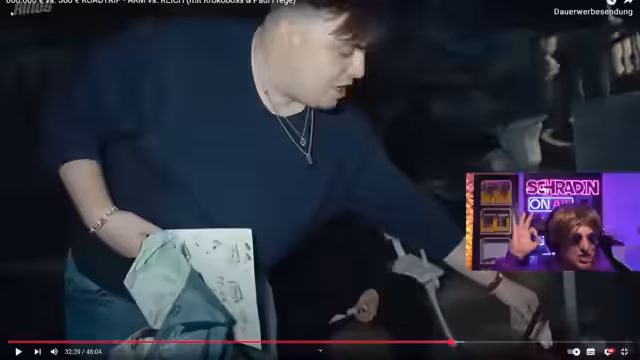00:31:33Schradin kündigt für morgen einen Livestream um 16 Uhr an und plant, ein ein Jahr altes Reaction-Video zum Thema Humor zu zeigen. Er fragt, wie weit Spaß und Humor gehen dürfen und ob es rote Linien gibt. Er betont, dass er niemanden beleidigen oder kränken möchte und dass Witze auch kränken können. Weiterhin spricht er über die Planung einer Rollator-Tour, entweder von Cuxhaven nach St. Peter-Ording (Nordsee) oder von Lübeck nach Strahl-Sund (Ostsee). Er möchte einen Stargast dabei haben, idealerweise Hand of Blood, und fragt auch Joey Kelly, Knossi und Monte an. Die Gruppe soll aus sechs bis acht Leuten bestehen. Er bittet den Chat, keine politischen Parteien mit drei Buchstaben zu erwähnen.