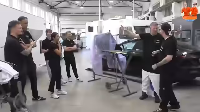 04:01:39Der Vorgang endet mit dem Auftragen der Farbschicht und einem kritischen Vergleich der Ergebnisse. Es wird festgestellt, dass die lackierte Fläche nicht perfekt ist und teilweise nicht gleichmäßig lackiert wurde, was auf mangelnde Übung und zu langsames Vorgehen zurückzuführen ist. Die Teilnehmer reflektieren ihre Leistung und geben sich gegenseitig eine Bewertung, bei der vor allem die Sorgfalt und das Gesamtergebnis bewertet werden. Sie ziehen eine Parallele zur echten Werkstattarbeit und respektieren den anspruchsvollen Job.