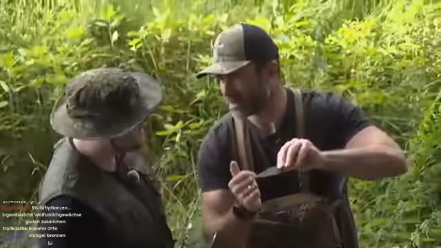 00:48:28Bei der Erkundung der Umgebung werden Wildschweine an einer Wasserstelle gesichtet, die aber nicht gejagt werden. Stattdessen konzentrieren sich die Streamer auf essbare Pflanzen wie Brennesseln. Otto demonstriert deren korrekte Zubereitung: Man muss gegen die Wuchsrichtung blättern, um die Brennhaare zu entfernen, und kann sie roh oder als Suppe zu sich nehmen. Dies erweitert das Survival-Wissen und bietet eine potenzielle Nahrungsquelle.