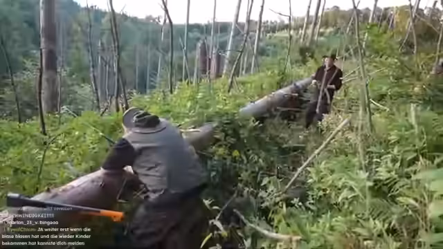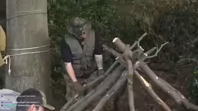 02:28:24Als Hauptaufgabe des Streams gilt das Fällen eines großen toten Baumes, um Brennholz zu gewinnen. Zarbex und Otto beschließen, diese Aufgabe gemeinsam zu meistern, stellen sich aber schnell als unterschiedliche Herangehensweisen heraus. Otto ist pragmatisch und schlägt vor, die Säge zu holen, während Zarbex den Kampf mit der Axt fordert. Die Aufgabe wird zu einer körperlich extrem anstrengenden und frustrierenden Herausforderung. Beide streamer sind schnell erschöpft und stoßen auf erhebliche Schwierigkeiten, besonders den dicken Stamm zu durchbrechen. Der Chat wird dabei zu einem ständigen Quell von bothscherzigen Kommentaren und Motivation, die jedoch eher die Anstrengung und den mangelnden Fortschritt unterstreichen.