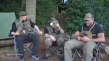 07:29:56Die Gruppe richtet ihr Lager für die Nacht ein. Es kommt zu technischen Problemen mit den Mikrofonen, die plötzlich leer sind, was sie zum Wechsel auf Richtmikrofone zwingt. Anschließend wird das Thema Hygiene im Wald angesprochen. Die Männer diskutieren die Herausforderungen, im Wald zu „machen“ und scherzen über Strategien und die Verwendung von biologischen Feuchtüchern. Sie bauen ihre Schlafplätze auf, wobei einer eine Isomatte als unzureichend empfindet und sich stattdessen auf dem Waldboden schlafen legt. Es wird über die Notwendigkeit von Feuerwachen und mögliche Gefahren im dunklen Wald gesprochen.