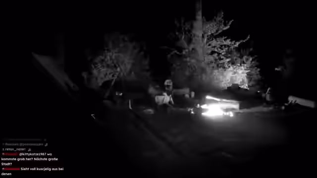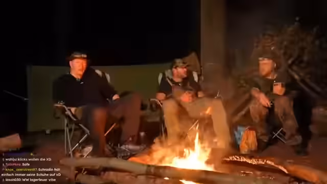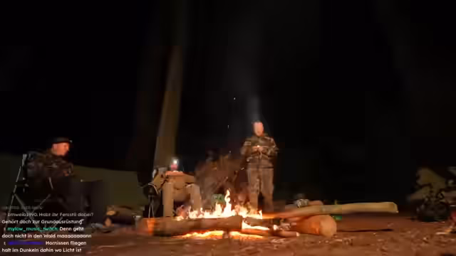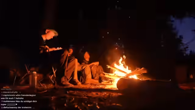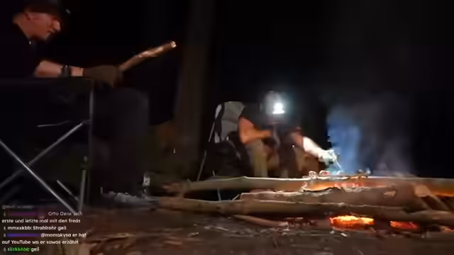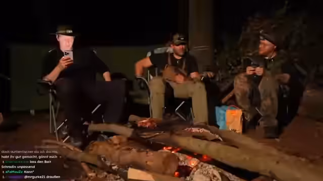 08:47:23Nachts wird die Stimmung spielerisch gruselig, als Schradin und Carsten versuchen, Otto durch versteckte Bewegungen am Lagerfeuer zu erschrecken. Der Humor trügt jedoch nicht über die körperliche Erschöpfung hinweg, die der anstrengende Tag, insbesondere das massive Baumhacken, hinterlassen hat. Carsten beschreibt Symptome eines beginnenden Kreislaufkollapses, der ihm zusetzte. Die Streamer planen Inhalte für zukünftige Streams und unterhalten sich über die Belastung eines längeren Survival-Abenteuers.