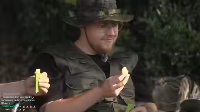 05:53:36Nach dem erfolgreichen Grillen teilen sich die Streamer das Fleisch. Otto organisiert ein improvisiertes "Notration"-Paket für Carsten mit Hundefutter als Gag, das sich jedoch als essbar erweist. Gleichzeitig versuchen sie, die Plattform für die Nacht vorzubereiten und umzuhauen. Sie führen Planschereien durch, um den Boden zu kühlen und die Hitze zu reduzieren. Gemeinsam konsumieren sie das Grillgut und lassen einen entspannten, gemeinschaftlichen Moment im Wald zu.