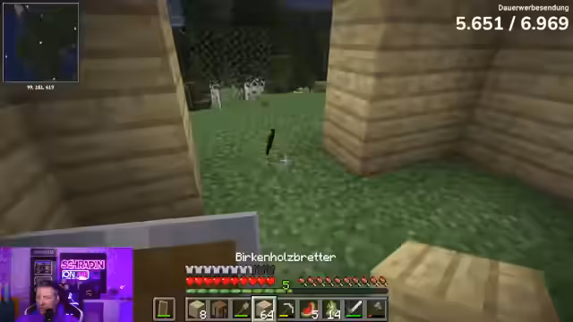 01:44:02Nach dem Sammeln von Ressourcen beginnt der Streamer mit dem Bau einer festen Basis in Minecraft, aus Birkenholz. Er drückt seine Begeisterung für das Projekt aus und plant, von dieser Basis aus auf Diamantenjagd zu gehen. Während des Baus wird die Notwendigkeit von Nahrung und einem Bett hervorgehoben, um das Überleben zu sichern. Der Streamer interagiert mit Chatmitgliedern, die Ratschläge zur Verbesserung der Basisstruktur geben.