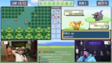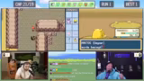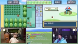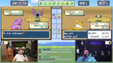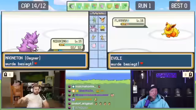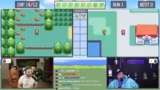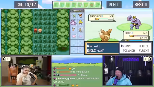 02:46:30Der Kampf gegen den Arena-Leiter Rocco beginnt, der Gestein-Pokémon einsetzt. Die Chat-Eingaben sind auf Emote-Only gestellt, um reines Gameplay zu gewährleisten. Nachdem Rocco zwei Pokémon besiegt wurden, kommt das dritte und stärkste Pokémon Flamara zum Einsatz. Während des Kampfes kommt es zu einem taktischen Fehler, da ein Tackle-Angriff auf Grund des Sandwirbel-Angriffs des Gegners daneben geht und Evoli schließlich besiegt wird.