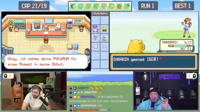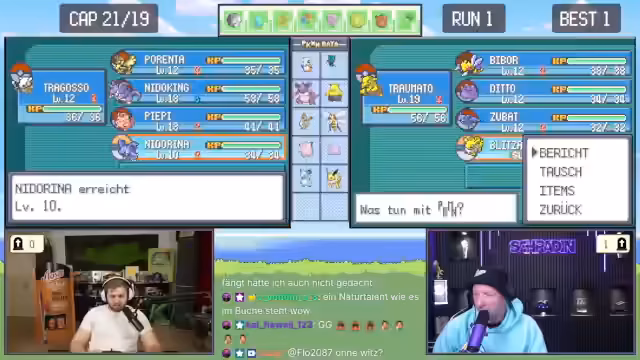 04:37:56Nach einem erfolglosen Kampf gegen ein wildes Raupi identifiziert der Streamer sein Problem: Er ist ohne Tränke. Auf Anraten des Chats wechselt er sein Pokémon, aber als das ebenfalls scheitert, gerät er unter Druck. Während eines weiteren Kampfes bemerkt er, dass ein Ditto sich in das gegnerische Pokémon verwandelt und beide nur die nutzlose Attacke Platscher einsetzen, was zu einem witzigen, aber ineffektiven Duell führt. Der Streamer ist verärgert über diese Situation, die er als dilettantisch empfindet, und konzentriert sich nun darauf, mit einem eingesetzten Trank die Situation zu retten und weiterzuziehen.