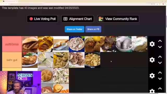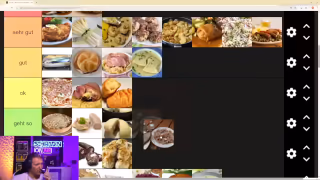 03:02:15Schradin startet ein Ranking deutscher Speisen mit seinem Chat. Er geht durch verschiedene Optionen wie Blutwurst, Currywurst, Nürnberger Rostbratwürstchen, Mettbrötchen, Schnitzel, Spargel, Leberwurst, Sauerkraut und viele mehr. Der Chat stimmt über die Beliebtheit und Geschmack ab. Es entstehen Diskussionen über Klassiker wie Currywurst und Bratwurst, die einstimmig auf Platz 1 landen, während Gemüsetasche und Schupfnudeln klar abgelehnt werden. Kroketten erstaunen durch geteilte Meinungen, während Frikadellen, Bratkartoffeln und Nudelsalat als sehr beliebt gelten. Schradin vergleicht manche Gerichte mit Steak und anderen internationalen Speisen, bleibt aber beim deutschen Ranking.